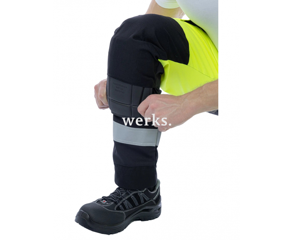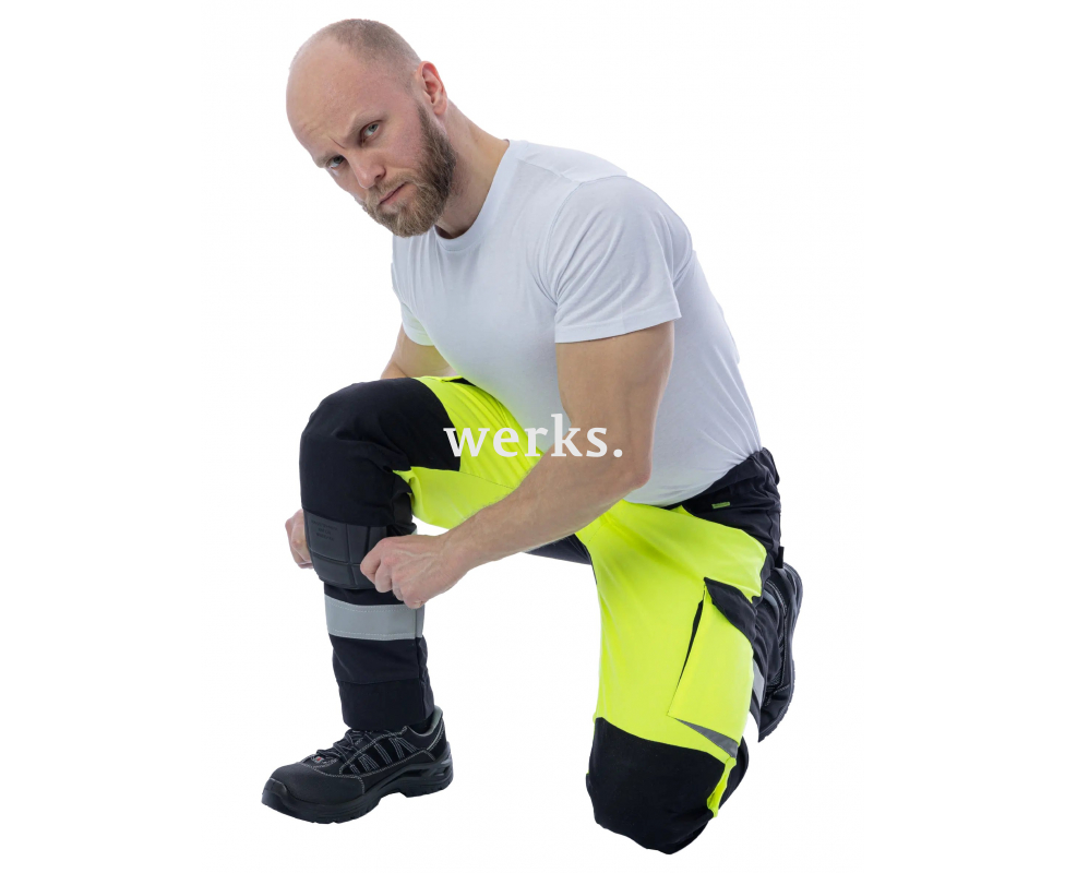 Сигнальные брюки BRODEKS KS309, желтый/черный - практичные рабочие брюки 2 класса видимости. За счёт флуоресцентного жёлтого цвета и широких светоотражающих лент отлично подходят для работы в тёмных помещениях и на объектах, где важна заметность. 2 класс видимости Светоотражающие ленты 5 см 7 карманов: для рук, задние, набедренные, есть ленты для подвеса инструментов По бокам пояса есть резинки для удобной посадки по фигуре Широкие шлевки под ремень Отделения для наколенников Колени, низ брюк укреплены для защиты от истирания Запас удлинения штанин на 5 см Полукольцо для карабина Материалы: Материал верха: Workshell 35% хлопок, 65% полиэфир, плотность 245 г/м2 Усиления (область коленей, низ): Coredura (100% полиамид 6.6) Ткань Workshell fabric плотностью 245 гр/м2 устойчива к разрывам и истиранию. Выдерживает интенсивные нагрузки. Хлопок обеспечивает мягкость и комфорт, а полиэстер - прочность и долговечность. Специальная отделка Easy Care упрощает уход, сохраняет цвет и структуру ткани. Coredura - высокотехнологичная ткань, плотностью 230 гр/м2, с водоотталкивающими свойствами. Волокна полиамида обладают исключительной устойчивостью к механическим воздействиям и сохраняют структуру после многократных стирок. Используется в местах подверженных максимальной нагрузке и легко очищается от загрязнений.