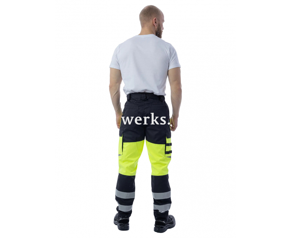 Сигнальные брюки BRODEKS KS309, желтый/черный - практичные рабочие брюки 2 класса видимости. За счёт флуоресцентного жёлтого цвета и широких светоотражающих лент отлично подходят для работы в тёмных помещениях и на объектах, где важна заметность. 2 класс видимости Светоотражающие ленты 5 см 7 карманов: для рук, задние, набедренные, есть ленты для подвеса инструментов По бокам пояса есть резинки для удобной посадки по фигуре Широкие шлевки под ремень Отделения для наколенников Колени, низ брюк укреплены для защиты от истирания Запас удлинения штанин на 5 см Полукольцо для карабина Материалы: Материал верха: Workshell 35% хлопок, 65% полиэфир, плотность 245 г/м2 Усиления (область коленей, низ): Coredura (100% полиамид 6.6) Ткань Workshell fabric плотностью 245 гр/м2 устойчива к разрывам и истиранию. Выдерживает интенсивные нагрузки. Хлопок обеспечивает мягкость и комфорт, а полиэстер - прочность и долговечность. Специальная отделка Easy Care упрощает уход, сохраняет цвет и структуру ткани. Coredura - высокотехнологичная ткань, плотностью 230 гр/м2, с водоотталкивающими свойствами. Волокна полиамида обладают исключительной устойчивостью к механическим воздействиям и сохраняют структуру после многократных стирок. Используется в местах подверженных максимальной нагрузке и легко очищается от загрязнений.