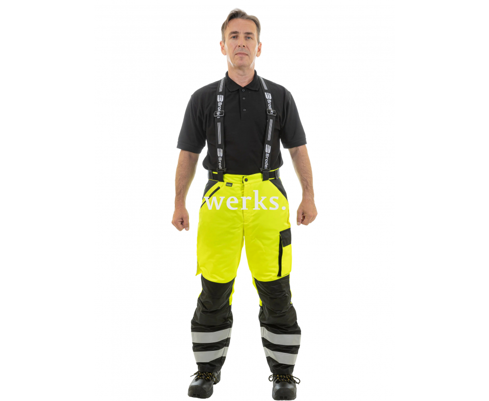 Брюки мужские зимние Brodeks KW 308, черный/желтый – утеплённые брюки повышенной видимости для пыльных и масляных работ. Выполнены из смесовой ткани с МВО-пропиткой. Она защищает от воды, масел, брызг кислот и щелочей. Брюки предназначены для пыльных и масляных работ в холодное время года Специальная пропитка от масел и воды, брызг кислот и щелочей Светоотражающие ленты Завышенная задняя часть для защиты поясницы от продувания + подтяжки Есть регулировка на поясе с помощью резинки и липучки 7 карманов: два косых кармана для рук, один верхний на молнии, задний карман, боковые карманы – один для инструментов и один с двумя входами для хранения деталей Есть отделения для наколенников на липучке Брюки можно носить с поясом, есть широкие шлёвки По низу брюк – снегозащитные манжеты и молния по бокам для высокой обуви Материалы: Материал верха: Rebel (33% хлопок, 67% полиэфир), 245 г/м2, МВО-пропитка Утеплитель: Shelter (100% полиэстер), 100 г/м2 При помощи технологии биверного плетения полиэфир в составе ткани Rebel выведен наружу. Ткань дополнительно обработана масловодооталкивающей пропиткой. Таким образом обеспечивается высокая устойчивость к различным видам загрязнений, маслам, растворам кислот и щелочей. Подробнее о ткани...