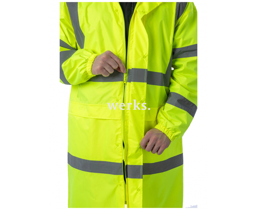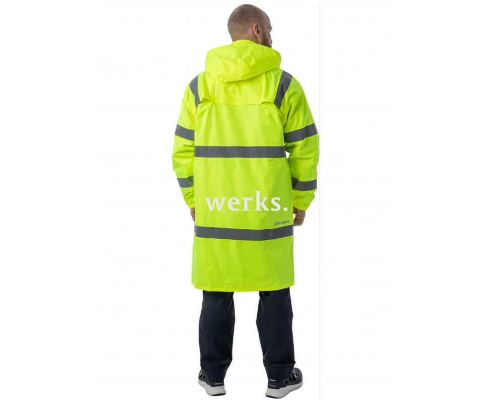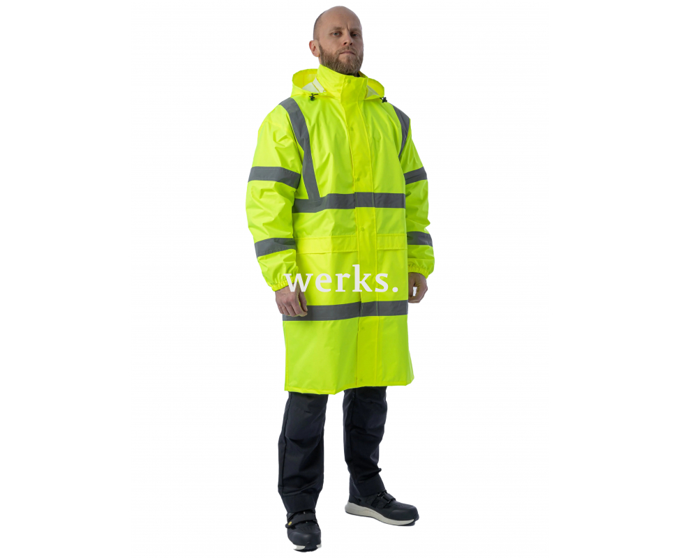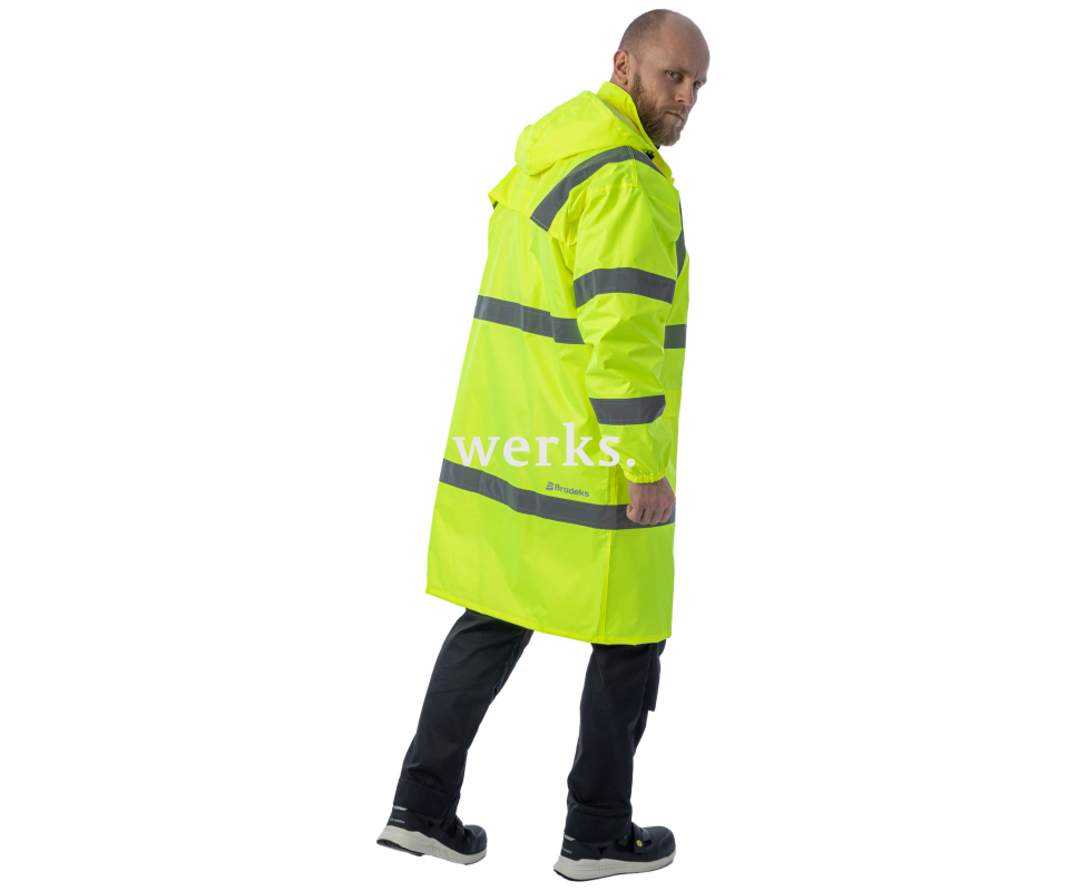 Плащ-дождевик Brodeks KS 252 разработан для работы в условиях повышенной влажности и низкой видимости. Изготовлен из прочного полиэстера с PU-покрытием, обеспечивающим водонепроницаемость, с герметизированными швами для максимальной защиты от осадков. Вентиляционные элементы на спинке и в области подмышек способствуют циркуляции воздуха, предотвращая перегрев. Несъемный капюшон регулируется эластичным шнуром. При необходимости его можно убрать в карман воротника. Два накладных кармана с клапанами защищают содержимое от влаги, а светоотражающая лента на спине, спереди и на рукавах повышает видимость. 3 класс повышенной видимости PU отделка СВ ленты шириной 50 мм Швы с герметизацией 2х замковая молния Воротник-стойка с карманом для капюшона Накладные карманы закрыты планками Люверсы для вентиляции Доступно в размерах от S до 4XL Материалы: Основная ткань: 100 % полиэстер, плотность 150 г/м2 Внутренняя сетка: 100% Полиэстер, плотность 70 г/м2