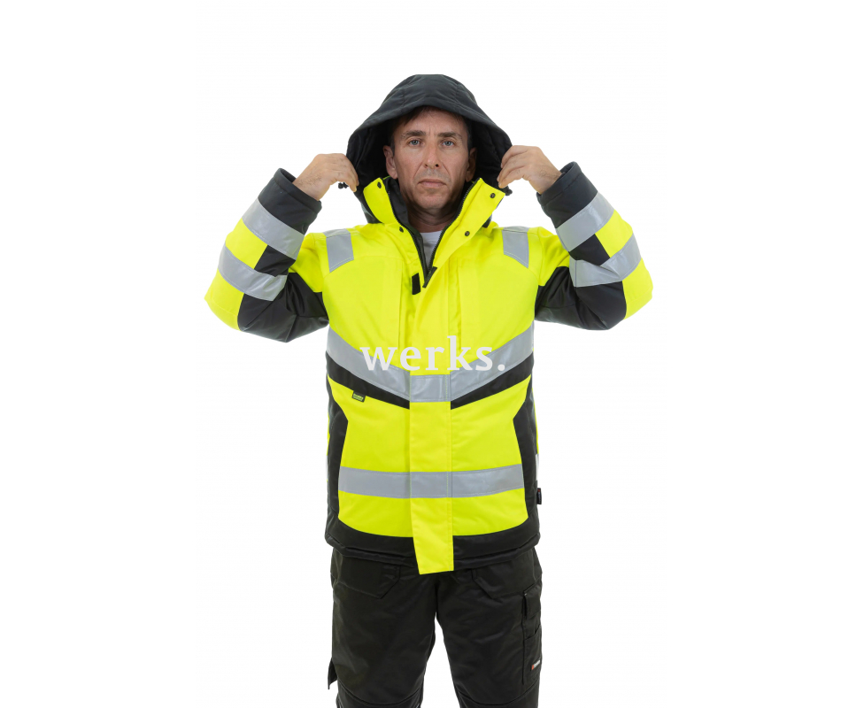 Зимняя сигнальная куртка BRODEKS KW216, желтый/черный – тёплая куртка с защитой от масел, брызг кислот, щелочей и капель воды. Сшита из смесовой ткани с масло- и водоотталкивающей пропиткой. Она делает куртку непромокаемой и защищает её от масел, брызг кислот и щелочей. Защита от воды, масел, брызг кислот, щелочей Капюшон отстегивается, регулируется, можно носить с каской Теплый воротник из флиса Удлинённая задняя часть для защиты от ветра Ветрозащитная юбка Анатомический крой рукавов Теплые манжеты 4 кармана на молнии снаружи куртки, два нижних кармана для рук с утеплением 2 кармана внутри куртки: большой для документов и маленький на молнии для хранения важных вещей Светоотражающие полосы Материалы: Материал верха: Rebel (33% хлопок, 67% полиэфир), 245 г/м2, МВО-пропитка Утеплитель: Shelter (100% полиэстер), 240 г/м2 При помощи технологии биверного плетения полиэфир в составе ткани Rebel выведен наружу. Ткань дополнительно обработана масловодооталкивающей пропиткой. Таким образом обеспечивается высокая устойчивость к различным видам загрязнений, маслам, растворам кислот и щелочей. Подробнее о ткани...