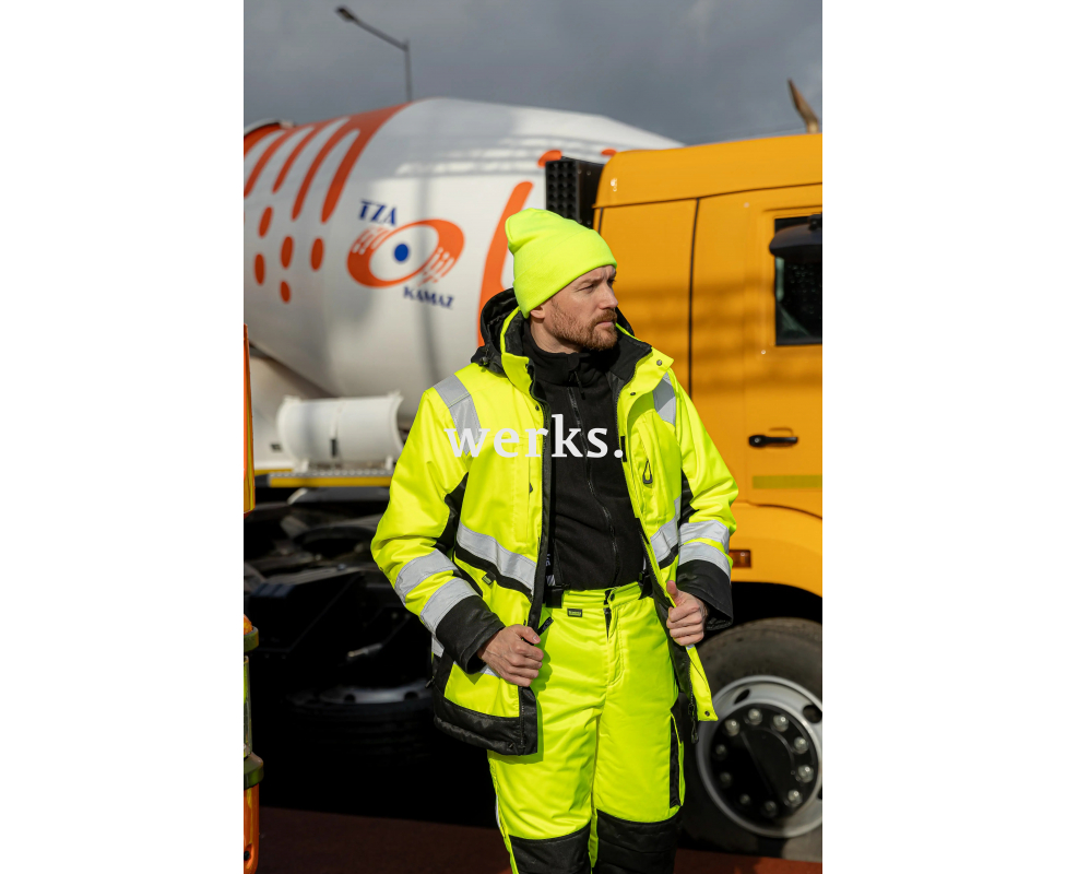 Зимняя сигнальная куртка BRODEKS KW216, желтый/черный – тёплая куртка с защитой от масел, брызг кислот, щелочей и капель воды. Сшита из смесовой ткани с масло- и водоотталкивающей пропиткой. Она делает куртку непромокаемой и защищает её от масел, брызг кислот и щелочей. Защита от воды, масел, брызг кислот, щелочей Капюшон отстегивается, регулируется, можно носить с каской Теплый воротник из флиса Удлинённая задняя часть для защиты от ветра Ветрозащитная юбка Анатомический крой рукавов Теплые манжеты 4 кармана на молнии снаружи куртки, два нижних кармана для рук с утеплением 2 кармана внутри куртки: большой для документов и маленький на молнии для хранения важных вещей Светоотражающие полосы Материалы: Материал верха: Rebel (33% хлопок, 67% полиэфир), 245 г/м2, МВО-пропитка Утеплитель: Shelter (100% полиэстер), 240 г/м2 При помощи технологии биверного плетения полиэфир в составе ткани Rebel выведен наружу. Ткань дополнительно обработана масловодооталкивающей пропиткой. Таким образом обеспечивается высокая устойчивость к различным видам загрязнений, маслам, растворам кислот и щелочей. Подробнее о ткани...